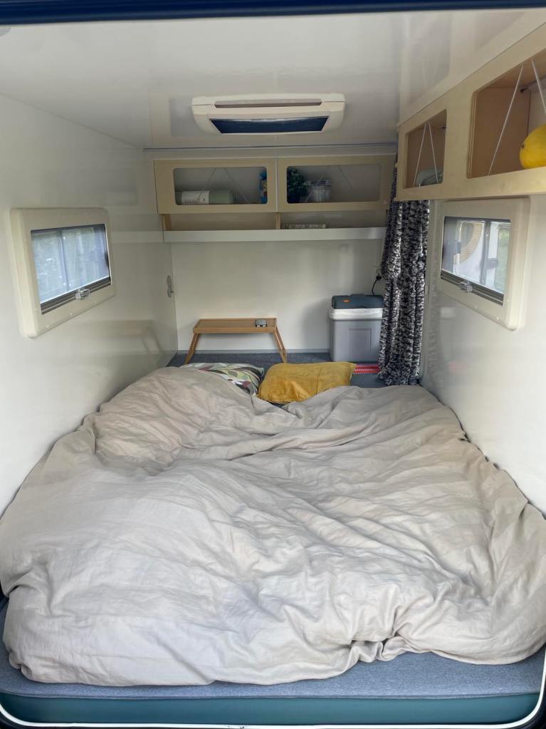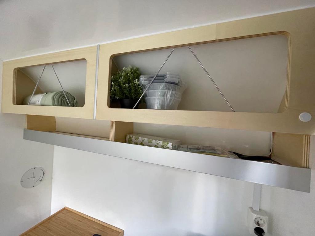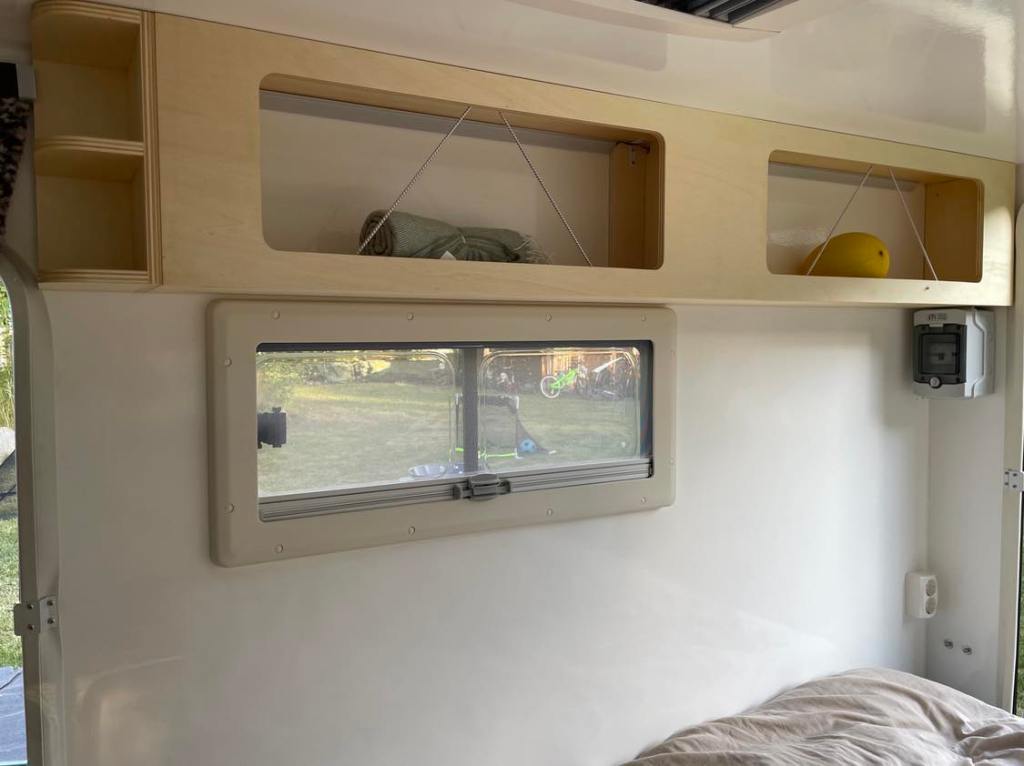 Vaipkattega põrand, põhjaalune panipaik, hoiustusriiul, pimendavad rulood ja sääsevõrgud, juhtmetoitel 220V pesad, õliradikas, päiksepatarei toitel USB pesad, 2x 70cm laiad magamismadratsid, lampvalgustus, söögiriistade komplekt, jalanõude alus, 2x väiksed padjad ja fliistekk.